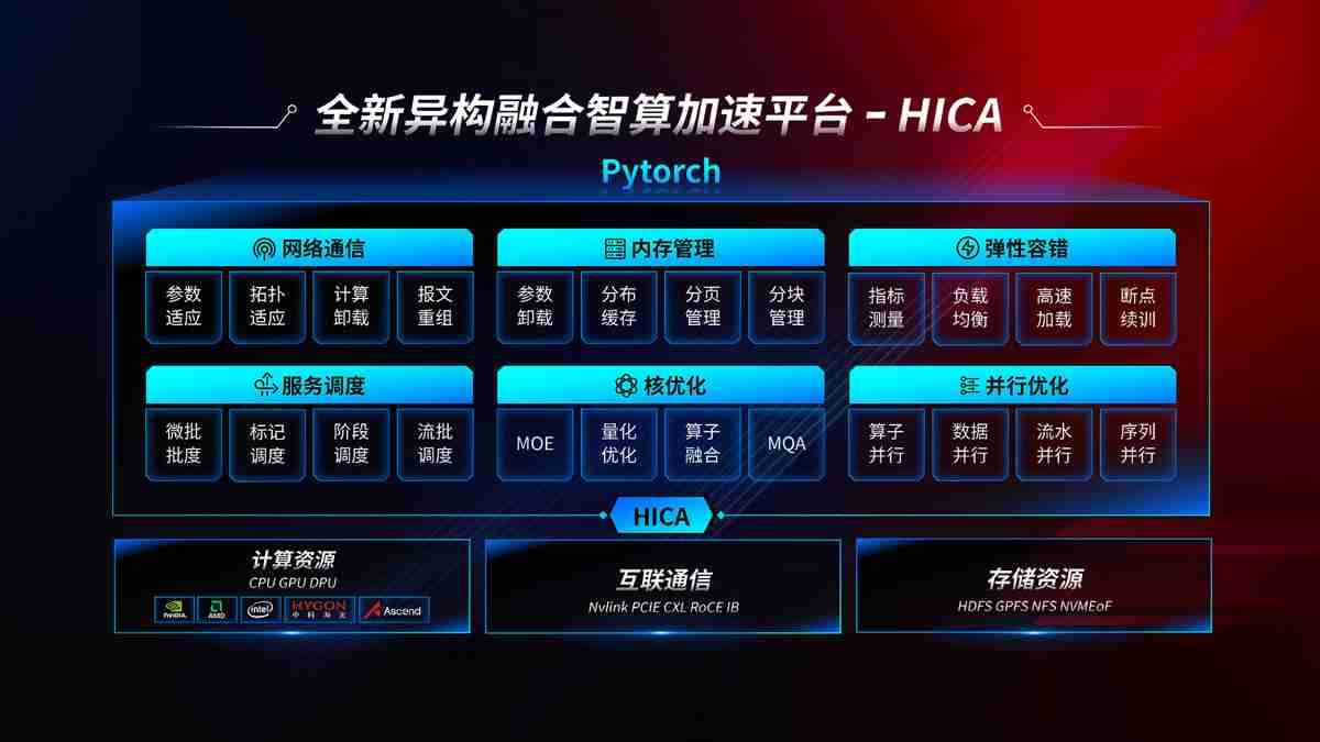通过自研的服务层、、中间适配层、、、、以及调度编排算法,,,采用数据并行、、、模型并行等多种并行方式,,,,把并行计算任务进行有效的分解,,使其分别由相应的软件栈和算力资源来承接。。。当GPU资源变化,,,HICA可以实时动态调度计算子任务并调整模型拓扑和架构,,,以充分聚合各种算力资源。。。。