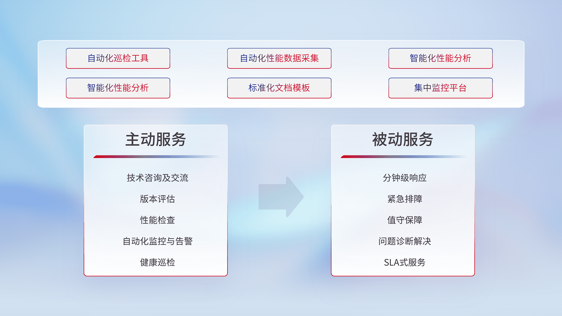 智能化工具和标准化文档,,,,保障服务质量,,,,提供主动服务(包含技术咨询、、、版本评估、、、性能检查、、、自动化监控与告警、、、健康巡检)和被动服务包含(分钟级响应、、紧急排障、、值守保障、、问题诊断解决、、、SLA服务)。。